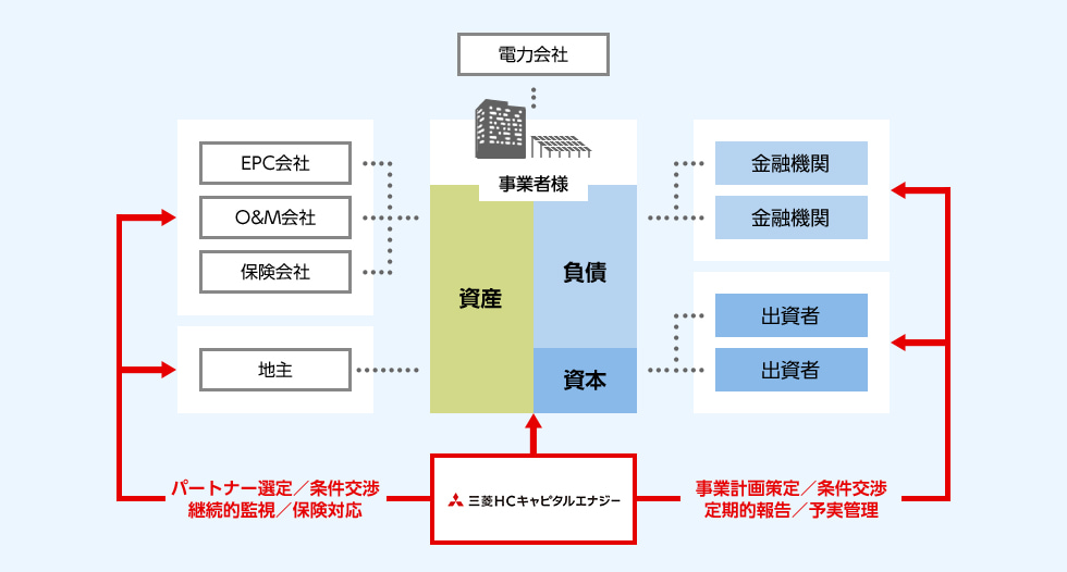 アセットマネジメント事業は太陽光発電事業・系統用蓄電池事業の事業運営や管理について業務執行の事務を受託します。これまでの自己投資実績に基づく経験から、より実務的な助言を行い事業をサポートします。
