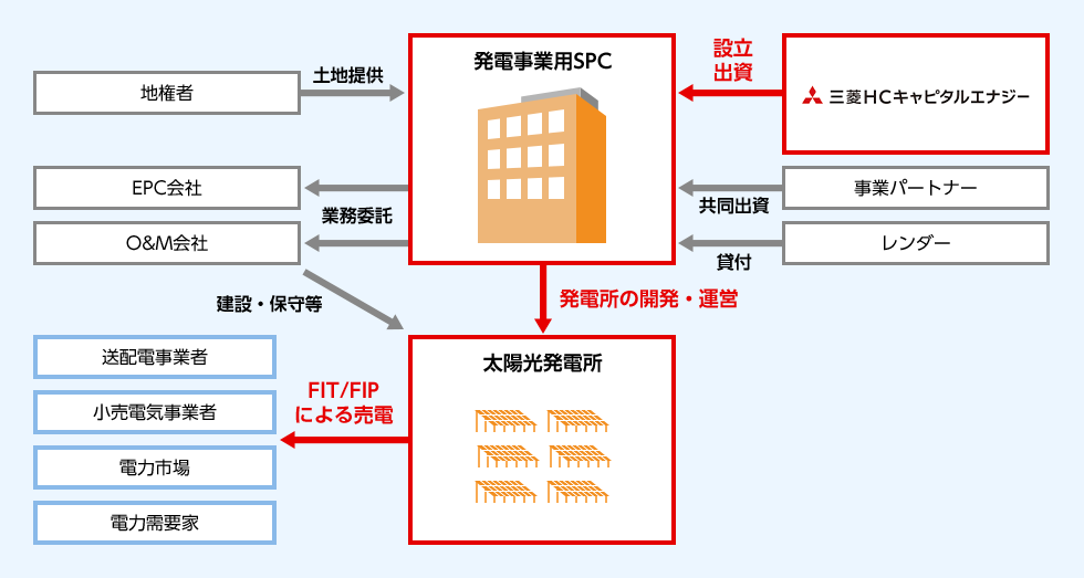 三菱HCキャピタルエナジーでは2015年よりFIT制度※を活用し、太陽光発電所を中心とした再生可能エネルギー事業の開発、取得、運営、管理を行っております。近年では2022年より制度が開始したFIP制度を活用した電源取得も積極的に行っており、再エネ電源の市場統合、主力電源化へ貢献しております。